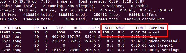 위 소스를 gcc -O0 test.c 로 빌드를 하면 top에서 cpu 사용량이 100%가 되는 것을 볼 수 있다. 계속 일을 하기 때문이다.