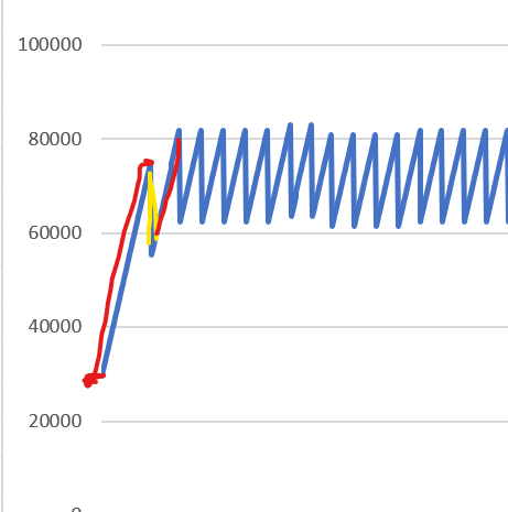 그래프를 보면 처음 쭉 오디오가 축적되다가 데이터 사용과 축적이 반복되고 있다.( 그래프의 빨간 선이 데이터 push, 노란 선이 pop)