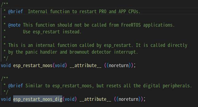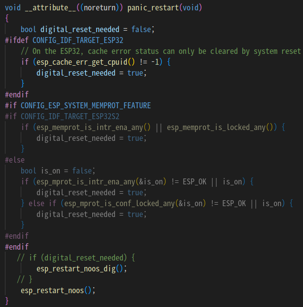 먼저 Panic handler behaviour를 ~~reboot로 설정하고 panic_restart함수를 보면 아래에 esp_restart_noos_dig 함수가 있다. 이 함수는 모든 디지털 주변레지스터를 초기화 한다고 나와있다.