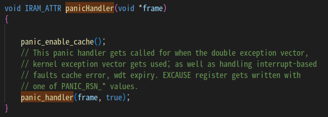 ESP32는 Exception 에러를 Panic이라고 하며 panicHandler 를 실행한다. 그래서 해당 함수내에서 장치를 끄는 예외코드를 삽입하면 된다.