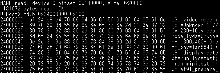- NAND에 저장된 값을 nand read로 읽어와 md.b로 확인한 결과, 데이터는 정상적으로 쓰여 있었습니다