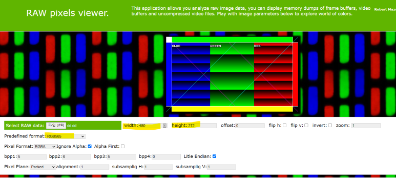 Image parameters Select RAW data: width: height: offset: flip h: flip v: invert: zoom: Predefined format: Pixel Format: Ignore Alpha: Alpha First: bpp1: bpp2: bpp3: bpp4: Litle Endian: Pixel Plane: alignment: subsamplig H: subsamplig V: