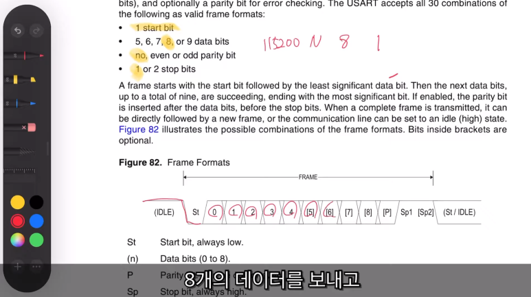 115200 bps로 8비트를 전송하는 경우, START 비트와 스톱비트 1비트씩 더하면
