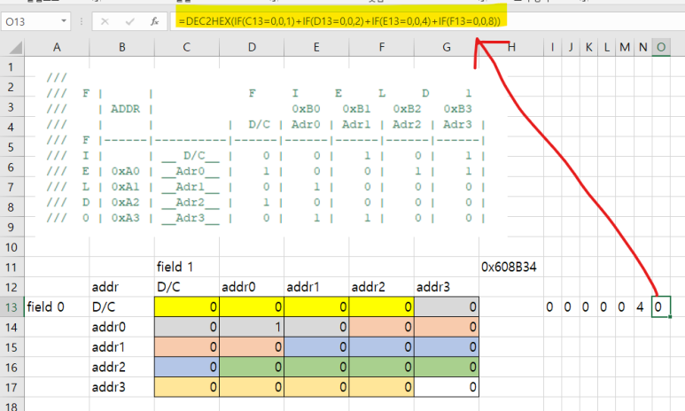 addr0, adddr 0 좌표만 1인 경우의 값을 헥사로 바꾸고 있고,