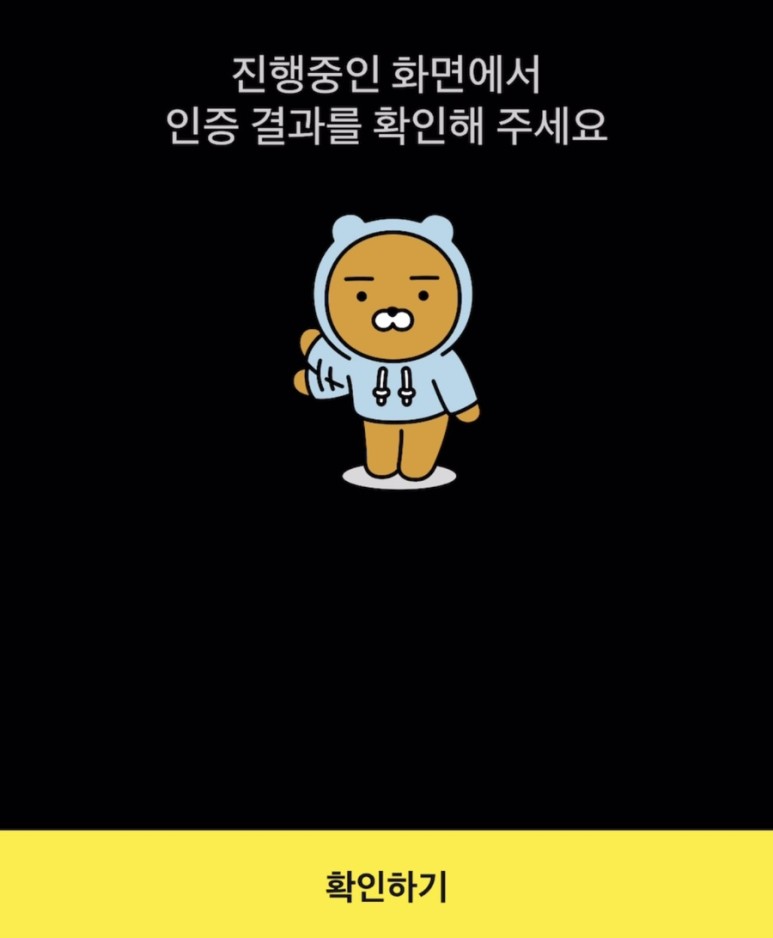 카카오페이 인증하기를 누르면 상황에 따라 다르지만 바로 아래처럼 인증요청이 올때가 있고 늦게 올때가 있습니다. 사용자가 많은 경우 나중에 해달라고 하거나 점검중에는 안되니 주의바랍니다.